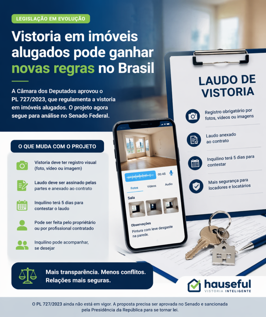 Atualmente, a legislação já prevê que o proprietário deve descrever o estado do imóvel no momento da entrega, caso solicitado pelo inquilino. No entanto, não há um padrão definido sobre como essa vistoria deve ser feita, o que frequentemente gera conflitos na devolução do imóvel.